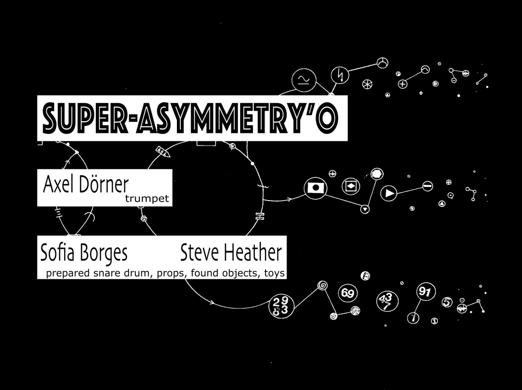 Super-Asymmetry’o is a trio formed by two non-identical parts – one trumpet and two snare drums – two instruments with a historical connection. Using various kinds of props as unexpected as they are suggestive, the two percussionists generate an equation composed of elastic loops, textures, rhythms, and patterns which interconnects with the equation suggested by the trumpet. Featuring a program that makes use of graphic scores, circular generative methods, and linear compositions, Super-Asymmetry’o essentially lives on spontaneous variables and unknown particles that may materialize in each performance.